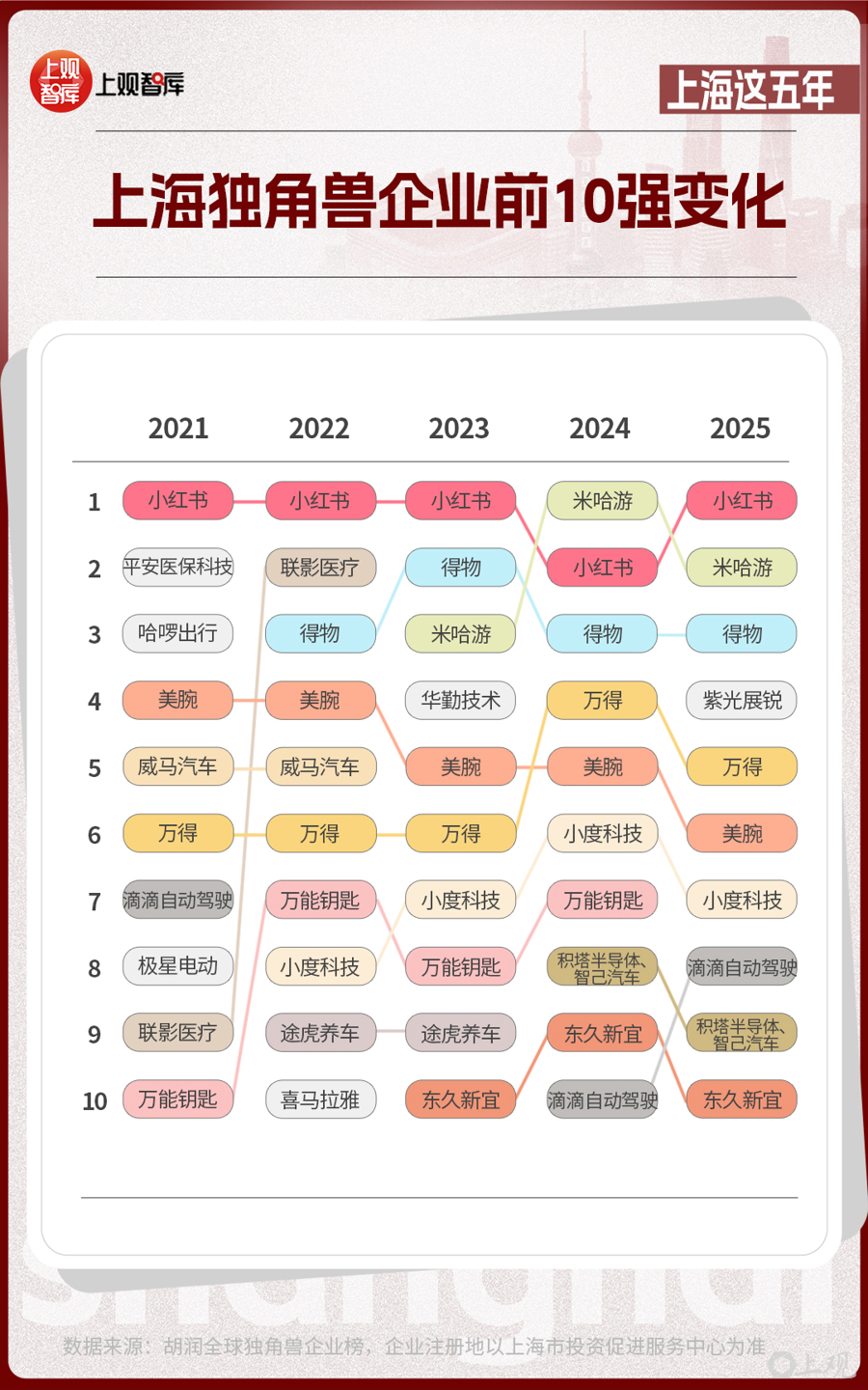 前10位的上海独角兽企业,从2021年到2025年,发生了不小的改变。有的企业已经上市,如联影医疗、华勤技术等;有的企业悄然退场;有的企业仍持续霸榜,如小红书、米哈游、得物、美腕、万得。独角兽企业的变动与产业趋势息息相关。当新能源汽车产业进入高质量发展的阶段时,智己汽车接过领军大旗;在AI芯片成为市场热点时,积塔半导体、紫光展锐已跻身芯片新势力代表之列。