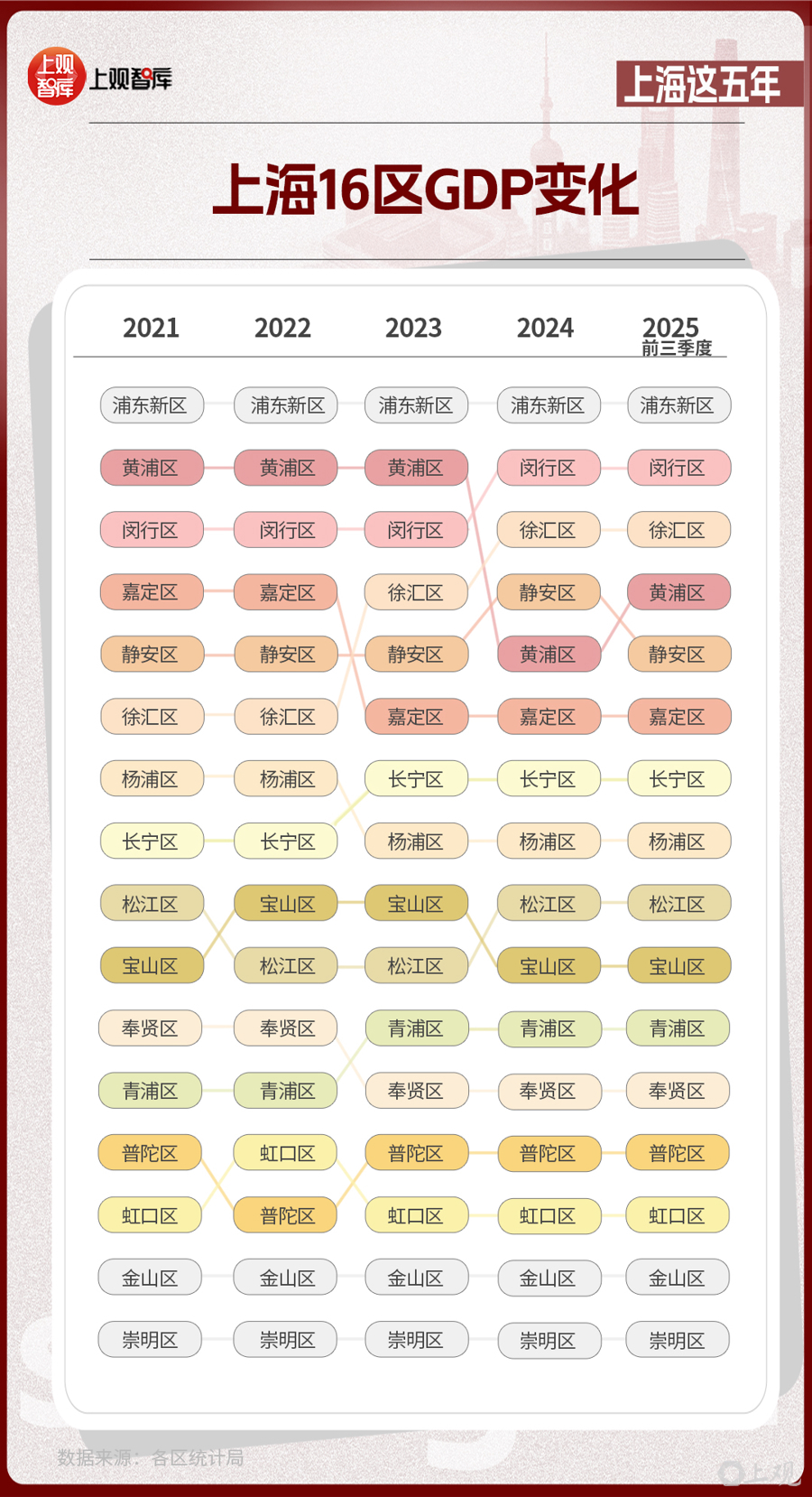 区域层面,上海16区GDP的变化,体现出从中心向多极扩散的趋势。2021年,浦东新区GDP占全市近36%,而到了2025年,这一比重下降至约33%。其他区在这五年间,充分发挥自身优势,齐头并进,为上海发展创造了更多增长极。