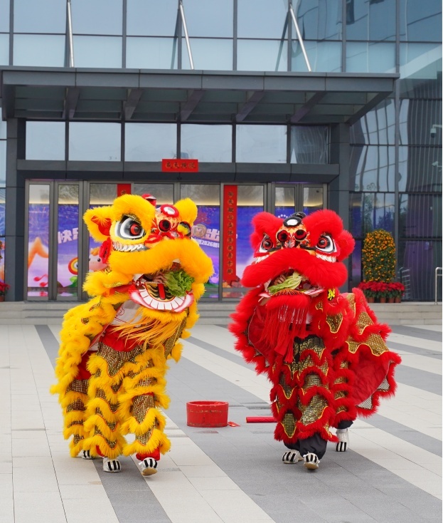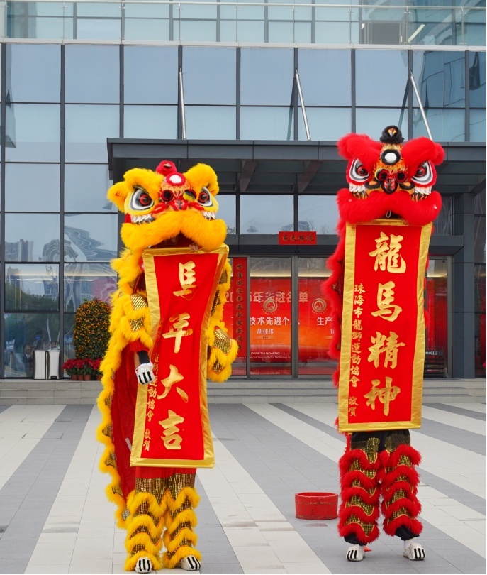 在珠海天成先进半导体科技有限公司,一场热闹的春节醒狮贺岁上演,雄狮起舞,跳跃翻腾,寓意企业在新的一年红红火火、大展宏图。